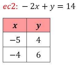 Para graficar cada ecuación en el plano cartesiano, basta con obtener dos puntos de cada una, y luego trazar una recta que pase por ambos puntos. Para cada ecuación, los puntos se pueden obtener realizando una pequeña tabla de valores con dos valores.