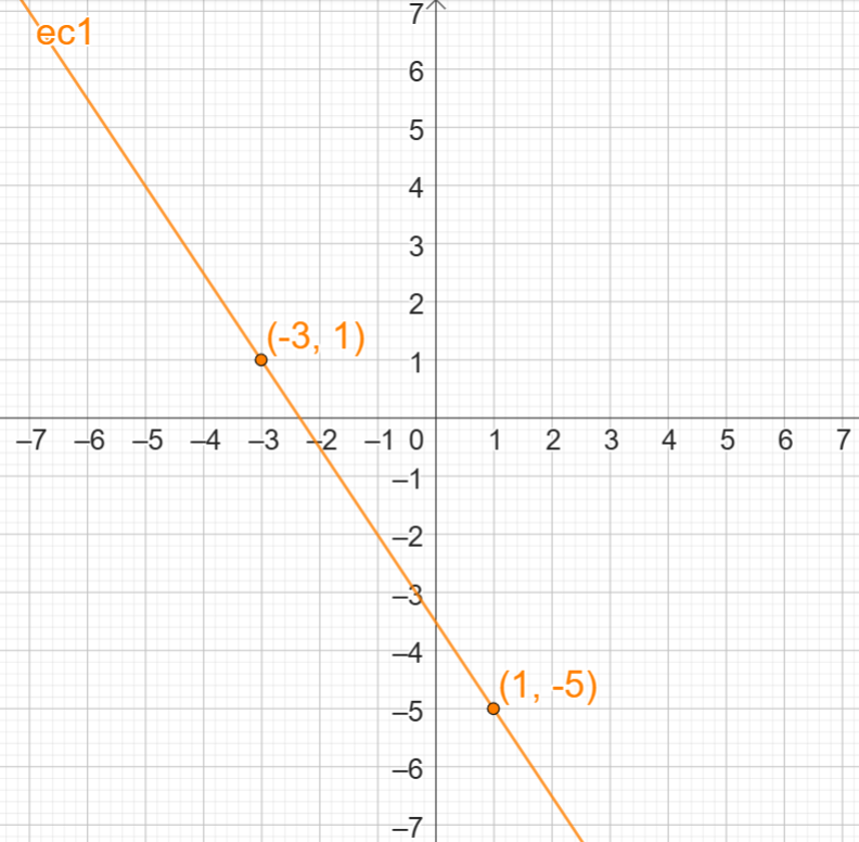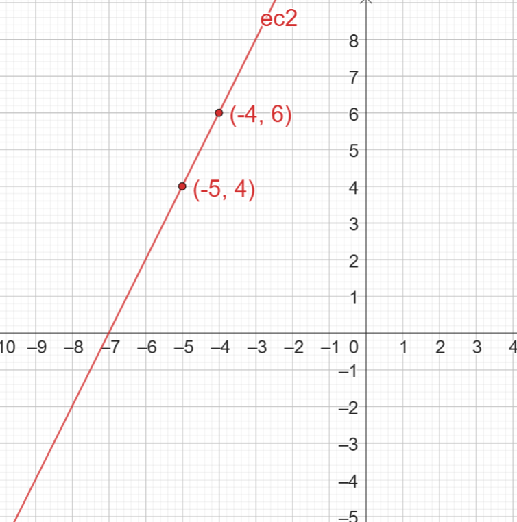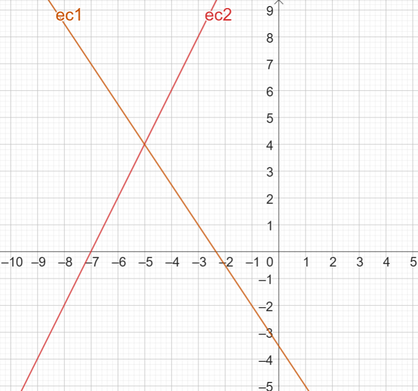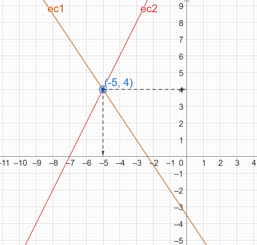1. Encontrar el punto de intersección: Determinamos las coordenadas del punto en el que se cruzan. Así, en la gráfica podemos observar que el punto en el que se cruzan, tiene como coordenada “x” el valor de -5, y como coordenada “y” el valor de 4: