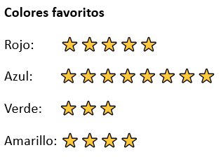 Supongamos que queremos representar el mismo conjunto de datos de colores favoritos con pictogramas. Utilizaremos un Ćcono de estrella (ā) para representar cada estudiante. La representación queda como la imagen de al lado.
