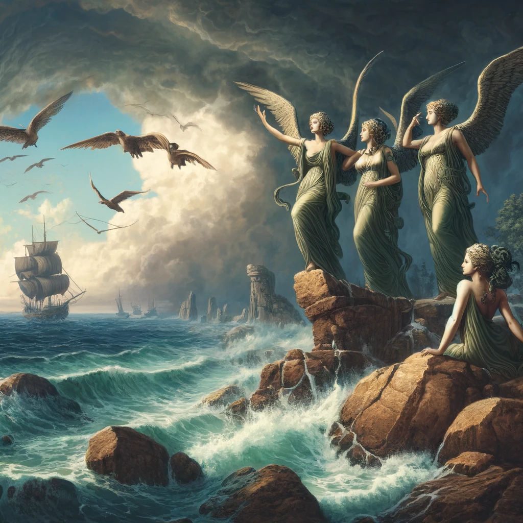Cuando los Argonautas pasaron en su nave por el sitio fatal, las sirenas cantaron para atraerles; pero Orfeo cantó con más dulzura y las eclipsó con los acentos de su lira. Y, como según tenía dispuesto el destino, la vida de las sirenas debía cesar en el momento que alguien escuchara sus cantos sin sentir el hechizo que estos producían, se precipitaron al mar y quedaron convertidas en rocas.
