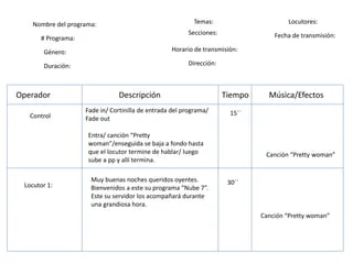 La estructura de un guion tĆ©cnico de radio contiene:Ā