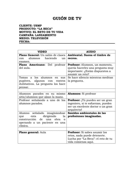 El guion es lo que da sentido a los sonidos. Es el marco de la historia. Reúne los elementos mÔs importantes y ayuda a la audiencia a comprender el significado de los puntos expuestos por la gente. El guion debe estar escrito en frases breves y sencillas.