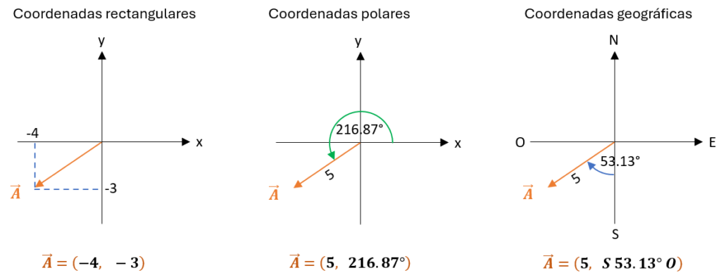 Hay tres formas principales en que se puede representar un vector: por sus coordenadas rectangulares, polares o geogrƔficas. En la siguiente imagen, como ejemplo, podemos ver al mismo vector representado en estos tres tipos de coordenadas: