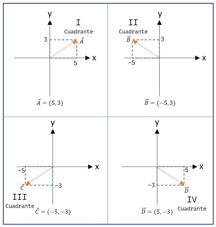• Usan los componentes del eje x y y del plano cartesiano. Recuerda que el plano cartesiano tiene como punto central el cruce entre los ejes x y y. Este punto divide al eje x (eje horizontal), en dos partes: el lado derecho es positivo y el lado izquierdo negativo; tambiĆ©n divide al eje y (vertical), en dos partes: el lado superior es positivo, y el lado inferior es negativo.