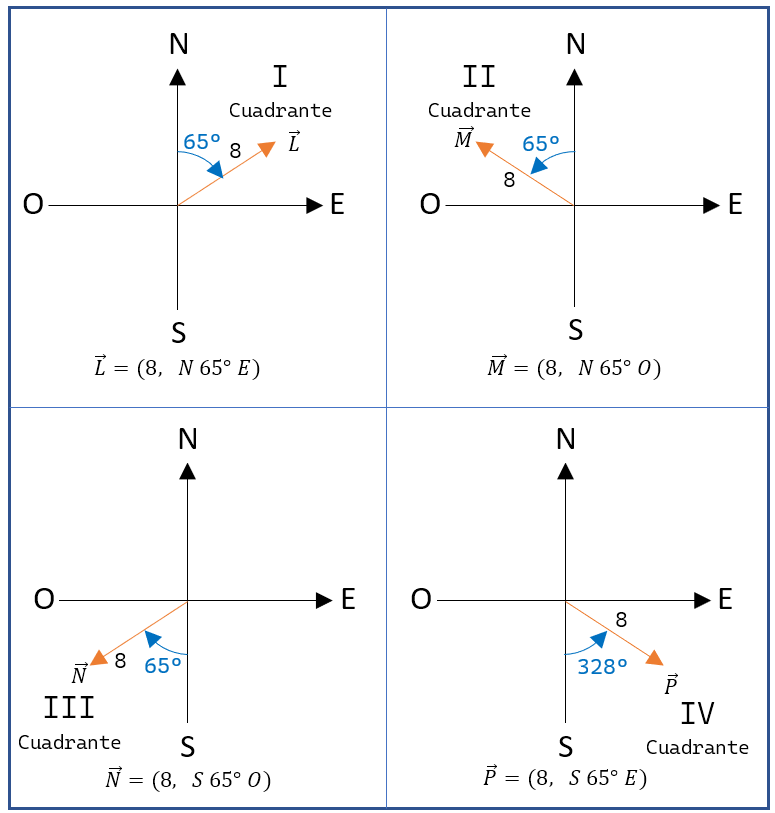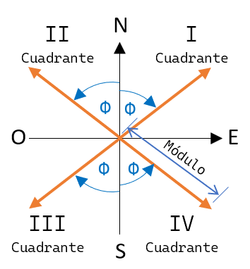 2. El Ôngulo parte desde el Norte o desde el Sur, hace el Este o el Oeste, dependiendo del cuadrante en que se encuentre el vector. Este Ôngulo mide menos de 90°.