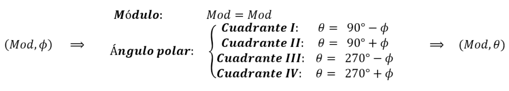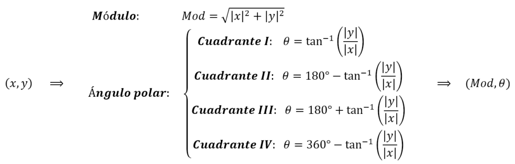 2. El Ć”ngulo polar parte desde el eje positivo de las “x”, y se abre en sentido antihorario. El Ć”ngulo polar puede tomar valores desde 0° hasta 360°.