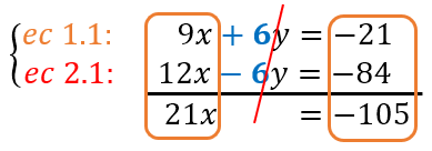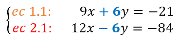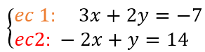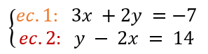 Resolvamos el siguiente sistema de dos ecuaciones con dos incógnitas. Para entender el uso de las ecuaciones en el procedimiento, usaremos por ejemplo “ec. 1” que significa “ecuación 1”; asĆ mismo, de ecuaciones obtenidas a partir de otras, como por ejemplo, “ec. 4.1” y “ec. 4.2” que significa que de la ecuación 4 se obtuvieron dos ecuaciones mĆ”s a las que hemos numerado 4.1 y 4.2.