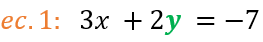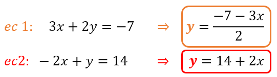 - Escogemos una ecuación y una incógnita. EscogerĆ©, por ejemplo, la ecuación 1 (ec. 1), y de ella la incógnita “y“.