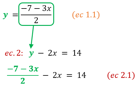 - Reemplazamos la expresión despejada de esta incógnita “y” (de la ec. 1.1) en la misma incógnita “y“ pero de la otra ecuación del sistema (ec. 2). De esta manera, obtendremos una nueva ecuación (ec. 2.1) con una sola incógnita, la incógnita “x”. VeĆ”moslo asĆ: