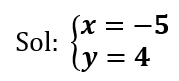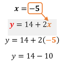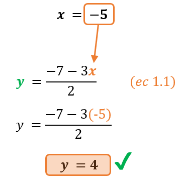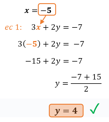 - Sustituir y resolver. Sustituye el valor encontrado en cualquiera de las ecuaciones para encontrar el valor de la otra incógnita. En nuestro caso, podemos sustituirlas incluso en cualquiera de las dos ecuaciones despejadas anteriormente. Por facilidad, escojamos reemplazar el valor de x=-5 en la ecuación que anteriormente encerramos en rojo: