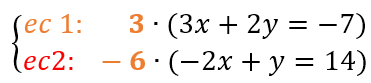 Entonces, el valor que debemos multiplicar a la primera ecuación es 3 y a la segunda ecuación es -6. De esta forma los coeficientes de la incógnita “y” que queremos eliminar serĆ”n iguales pero de signo contrario, 6 y -6. Al multiplicar los valores por cada ecuación, aplicaremos la propiedad distributiva (no olvidemos la ley de signos):