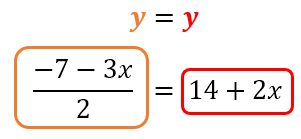 - Igualamos los valores de las incógnitas despejadas. En el lado izquierdo ponemos el valor de la incógnita despejada de una de las ecuaciones, y en el lado derecho colocamos el valor de la incógnita despejada de la otra ecuación. Como despejamos “y” de ambas ecuaciones, y dado que “y=y”, reemplazamos los valores de esta en una nueva ecuación (ec. 3):