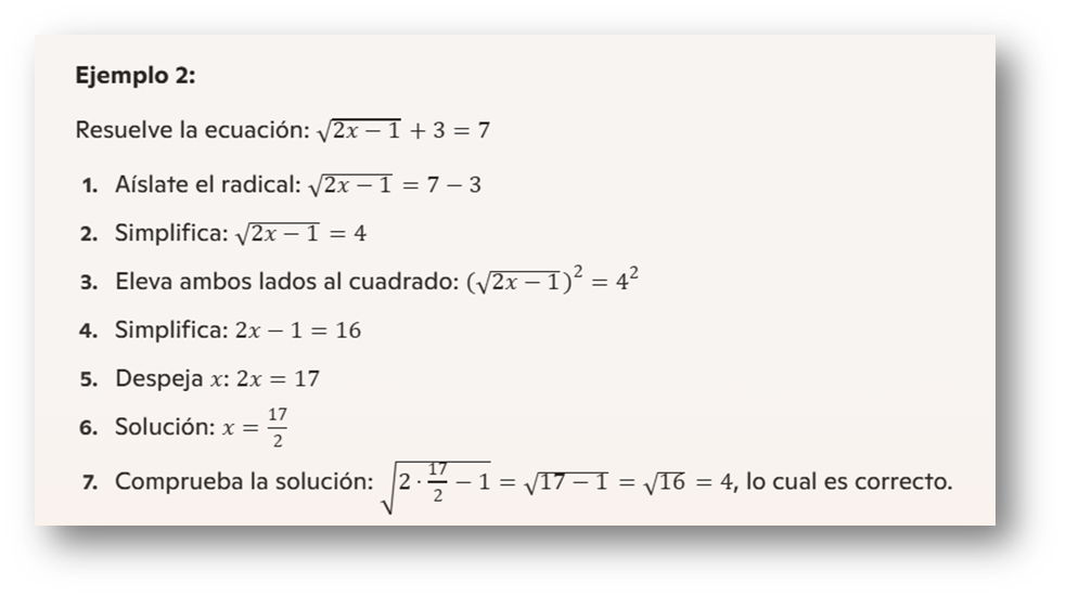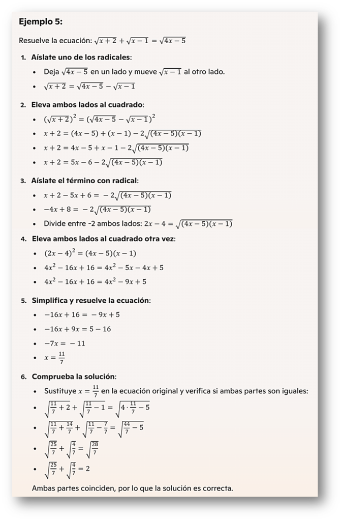 - Comprueba las soluciones: Sustituye las soluciones encontradas en la ecuación original para verificar que no se han introducido soluciones extraviadas al elevar al cuadrado.