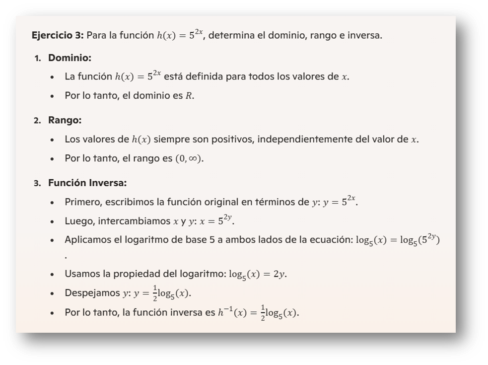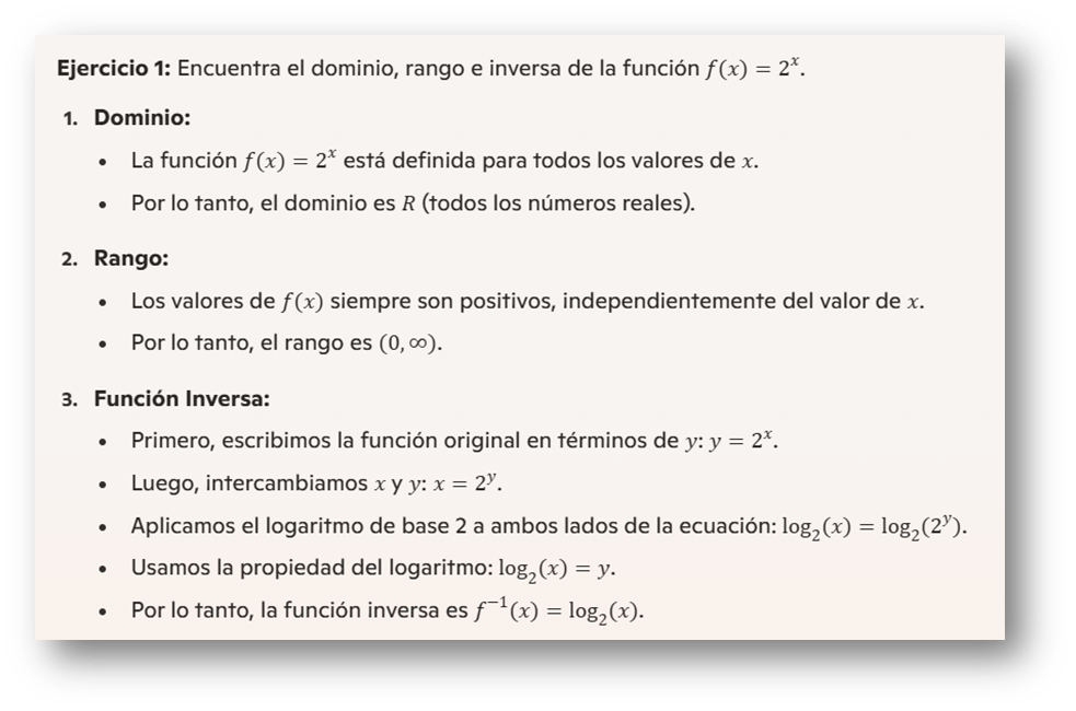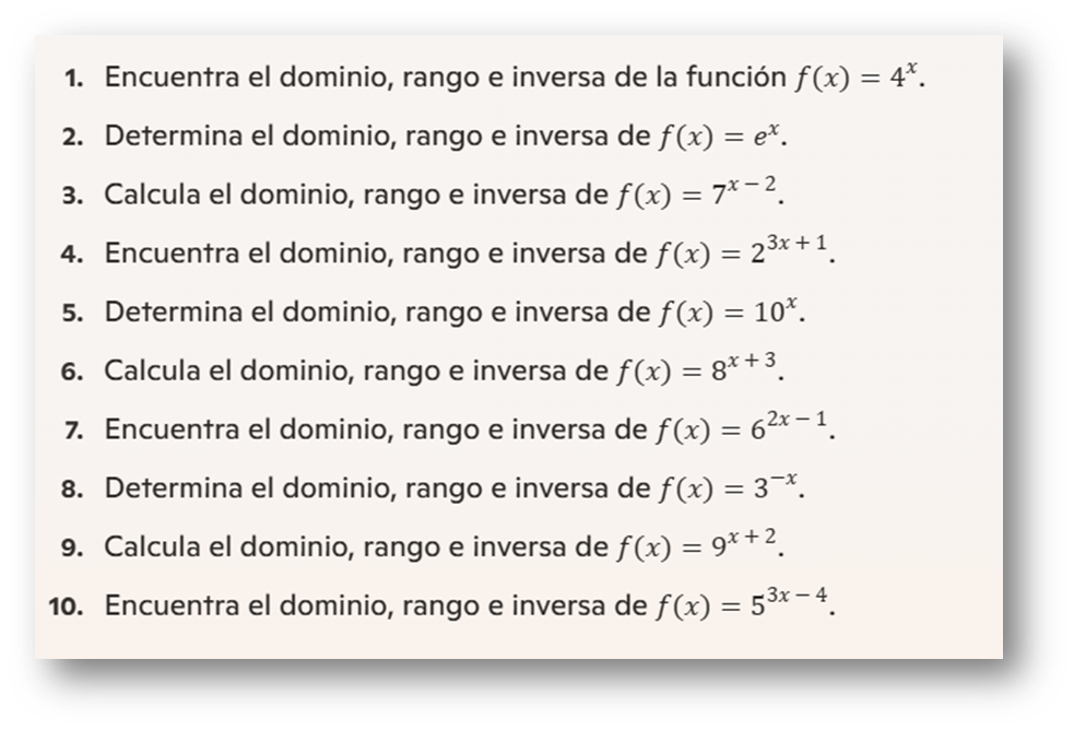 - Desarrollar habilidades para calcular dominio, rango y función inversa de funciones exponenciales.