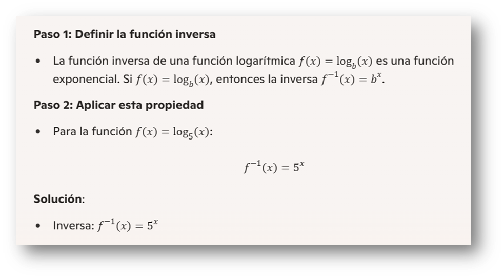 - La inversa de la función logarítmica f(x)=logb(x) es la función exponencial g(x)=bx.