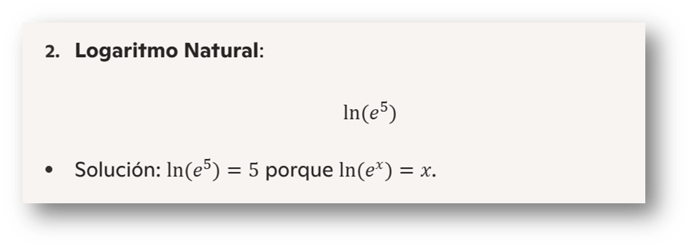 Los logaritmos naturales tienen como base el nĆŗmero e (aproximadamente 2.71828). Se denotan como logā”e(x) o mĆ”s comĆŗnmente como lnā”(x).