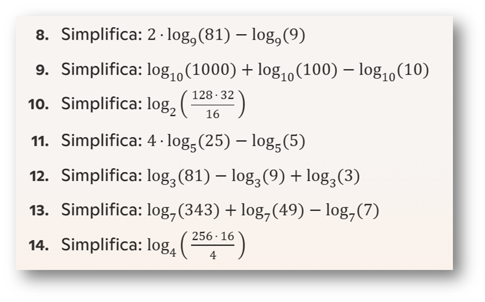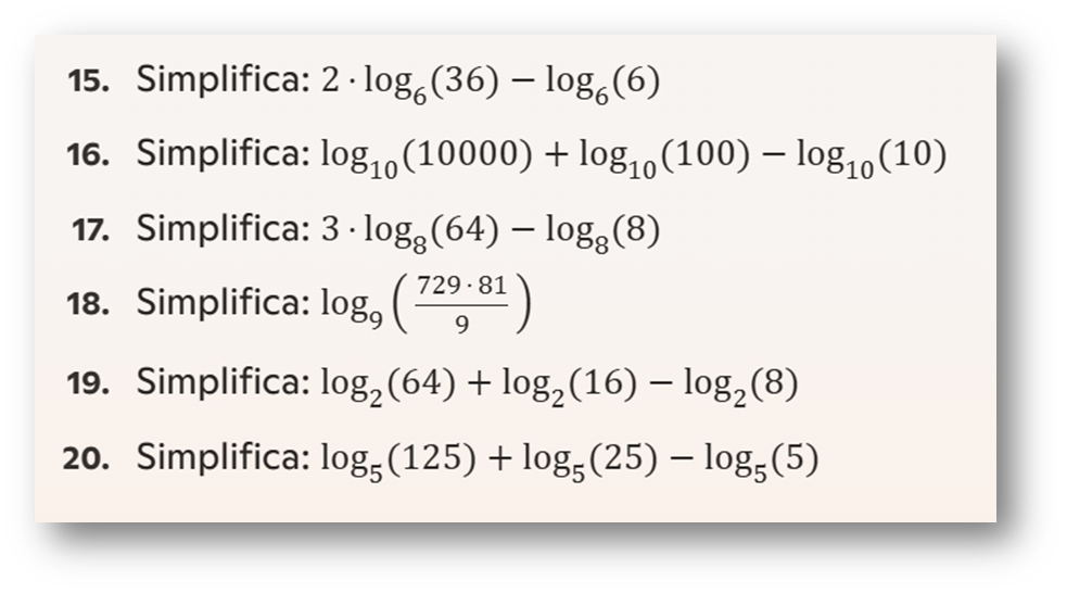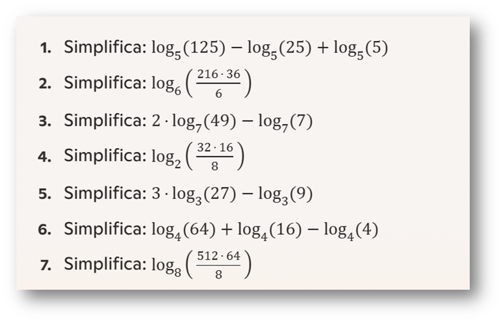 - Organiza una competencia donde los estudiantes, en equipos, deben simplificar expresiones logarĆtmicas combinadas lo mĆ”s rĆ”pido posible. Proporciona puntos por cada respuesta correcta y premia al equipo con mĆ”s puntos.