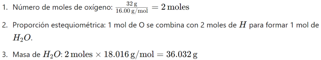 Ejemplo 6: ¿Cuánta masa de H2O se puede formar con 32 gramos de oxígeno?