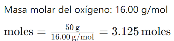 Ejemplo 1: ¿Cuántos moles hay en 50 gramos de oxígeno (O)?