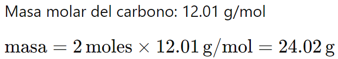 Ejemplo 2: ¿Cuántos gramos hay en 2 moles de carbono (C)?