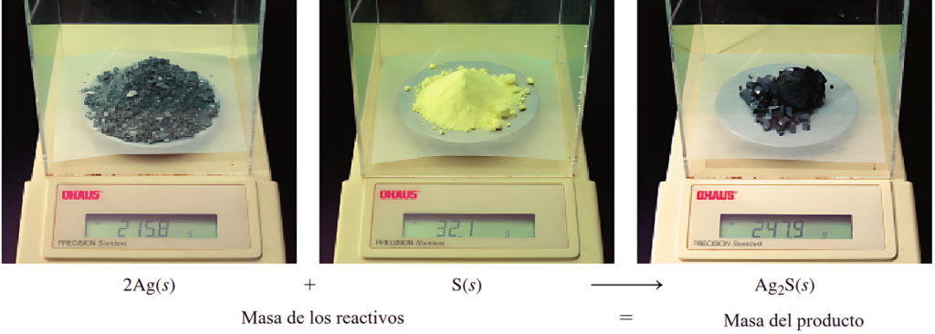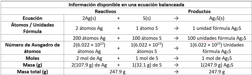 En esta reacción, el número de átomos de plata que reacciona es el doble del número de átomos de azufre. Cuando reaccionan 200 átomos de plata, se requieren 100 átomos de azufre. Sin embargo, en la reacción química real, muchos más átomos de plata y de azufre reaccionarían. Si estamos tratando con cantidades molares, entonces los coeficientes en la ecuación pueden interpretarse en términos de moles. Así, 2 moles de plata reaccionan con 1 mol de azufre para producir 1 mol de Ag2S. Como se puede determinar la masa molar de cada uno, las moles de Ag, S y Ag2S también pueden expresarse en términos de masa en gramos de cada uno. Así, 215,8 g de Ag y 32,1 g de S reaccionan para formar 247,9 g de Ag2S. La masa total de los reactivos (247,9 g) es igual a la masa del producto (247,9 g).