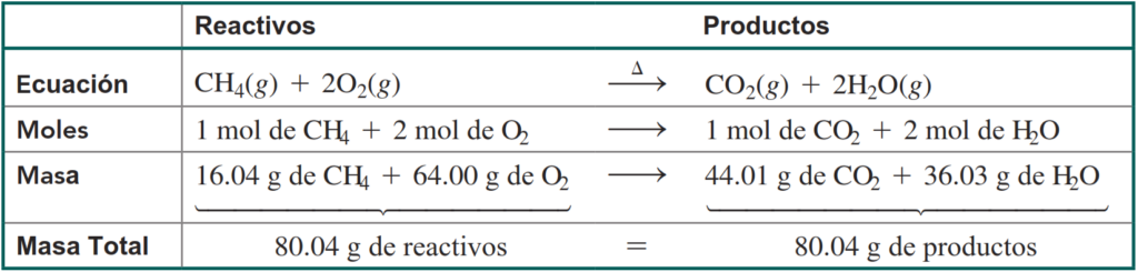 Ejemplo 1: La combustión del metano (CH₄) con oxígeno produce dióxido de carbono, agua y energía. Calcula la masa total de los reactivos y los productos para la siguiente ecuación cuando 1 mol de CH₄ reacciona: