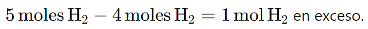 Por lo tanto, al final de la reacción, quedarÔ 1 mol de H2 sin reaccionar, y se formarÔn 4 moles de H2O.