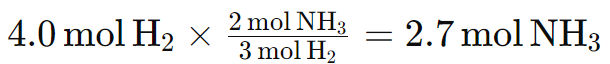 Ejemplo 1: En la ecuación N2 + 3H2 → 2NH3, ¿cuántos moles de NH3 se producirán cuando 4,0 moles de H2 reaccionen completamente con N2?