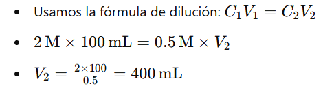 Ejemplo 1: Calcular el volumen final de una solución de 2 M que se ha diluido desde un volumen inicial de 100 mL hasta una concentración de 0.5 M.