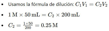 Ejemplo 2: Calcular la concentración final de una solución de 1 M si se diluyen 50 mL a un volumen final de 200 mL.