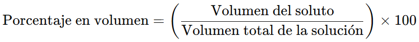 El porcentaje en volumen (% v/v) es una unidad que indica la proporción de volumen de un soluto (lĆquido) respecto al volumen total de la solución, expresada como porcentaje. La fórmula es: