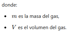 La densidad (Ļ) es una medida de la cantidad de masa por unidad de volumen y se expresa en unidades como gramos por litro (g/L) o gramos por metro cĆŗbico (g/m³) para los gases. Para un gas, la densidad depende de su masa molar, presión y temperatura, y se puede calcular mediante la ecuación de los gases ideales combinada con la definición de densidad: