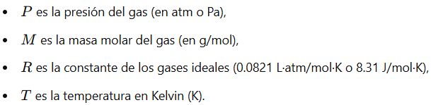 Al combinar la ecuación de los gases ideales (PV=nRT) con el concepto de densidad, se obtiene: