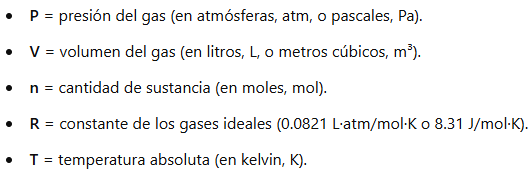 La ecuación de los gases ideales relaciona la presión, el volumen, la temperatura y la cantidad de sustancia de un gas mediante la fórmula: