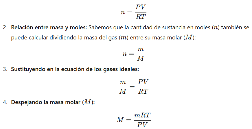 La masa molar de un gas es la masa de un mol de moléculas o Ôtomos de ese gas. Es una propiedad importante para entender la cantidad de sustancia presente en una muestra de gas y se utiliza en varias ecuaciones, como la ecuación de los gases ideales.