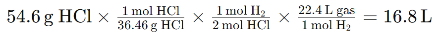 Ejemplo 1: El magnesio reacciona con el ácido clorhídrico, produciendo gas y cloruro de magnesio. ¿Cuál es el volumen de gas a CNTP producido en esta reacción cuando se tienen 54,6 g de HCl y Mg en abundancia?