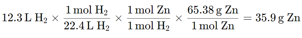 12,3 L de H2 gaseoso se crean cuando se añade el zinc al ácido sulfúrico. ¿Cuánto zinc, en masa, se necesita para esta reacción cuando ocurre en CNTP?
