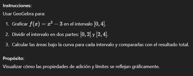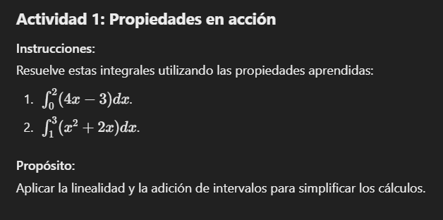 - Analizar las propiedades principales de las integrales definidas, como la linealidad, los lĆmites de integración, y la adición de intervalos.