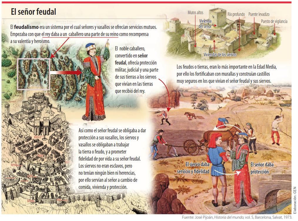 El castillo era el centro de poder del señor feudal. Estaba construido con gruesas murallas, fosos llenos de agua, puentes levadizos y torres de vigilancia. En su interior se encontraba la residencia del señor, asà como almacenes de alimentos y armas.