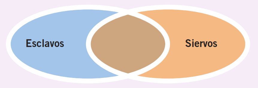 - En tu cuaderno, elabora un diagrama de Venn en el que se identifiquen las diferencias y semejanzas entre los esclavos y los siervos. Coloca las semejanzas en el medio.