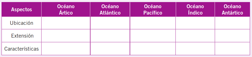 - Mediante un cuadro de doble entrada, elabora las características comparativas de los océanos: