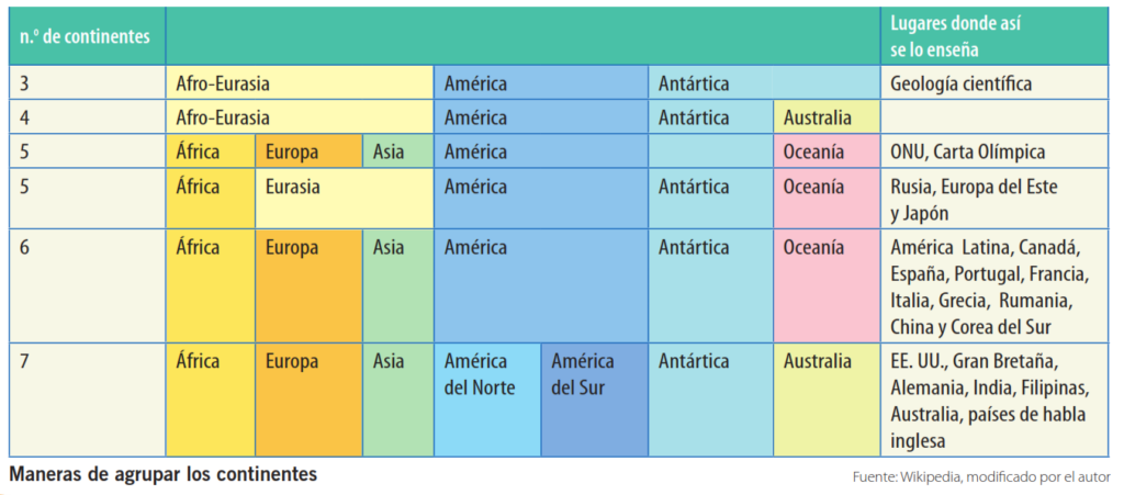 - Seis continentes: En algunos paĆses, Europa y Asia son considerados un solo continente, por lo que se cuenta a Afro-Eurasia como un Ćŗnico bloque.