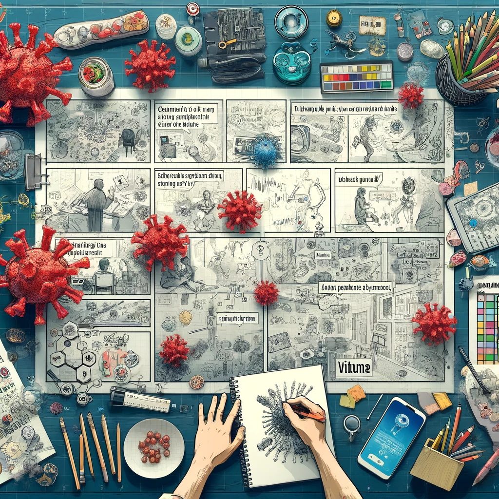 Tu misión: Asegúrate de que tu cómic sea tanto educativo como entretenido. ¿Puedes crear personajes memorables que ayuden a otros a entender mejor cómo funcionan los virus?