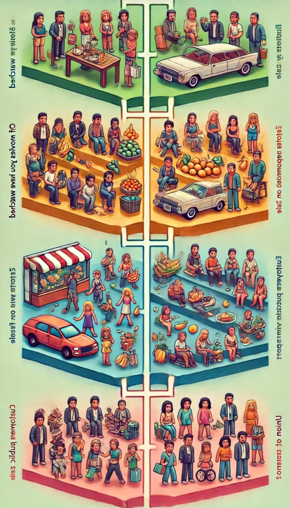 Conjunto de pelĆculas que has visto y conjunto de pelĆculas recomendadas por amigos: Si tienes un conjunto de las pelĆculas que has visto (Conjunto P) y otro con las pelĆculas que tus amigos te han recomendado (Conjunto R), puedes aplicar operaciones como la intersección para encontrar las pelĆculas que ya has visto y te recomendaron, o la diferencia para saber quĆ© pelĆculas te recomendaron pero no has visto aĆŗn.