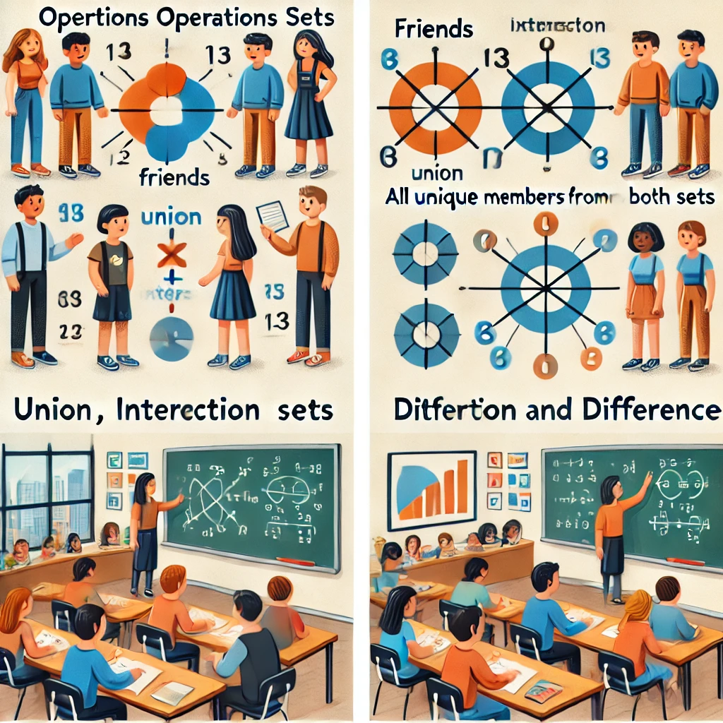 Hoy vas a aprender cómo combinar y manipular conjuntos de diferentes maneras. Las operaciones con conjuntos son fundamentales no solo en matemÔticas, sino también en el mundo real. Imagina que tienes dos conjuntos: el de tus amigos y el de tus compañeros de clase. ¿Qué sucede si quieres encontrar a los amigos que también son compañeros de clase? O tal vez quieras saber cuÔntos amigos no estÔn en tu clase. ”Todo eso es posible gracias a las operaciones entre conjuntos! AprenderÔs sobre unión, intersección, diferencia y complemento de conjuntos.
