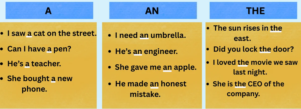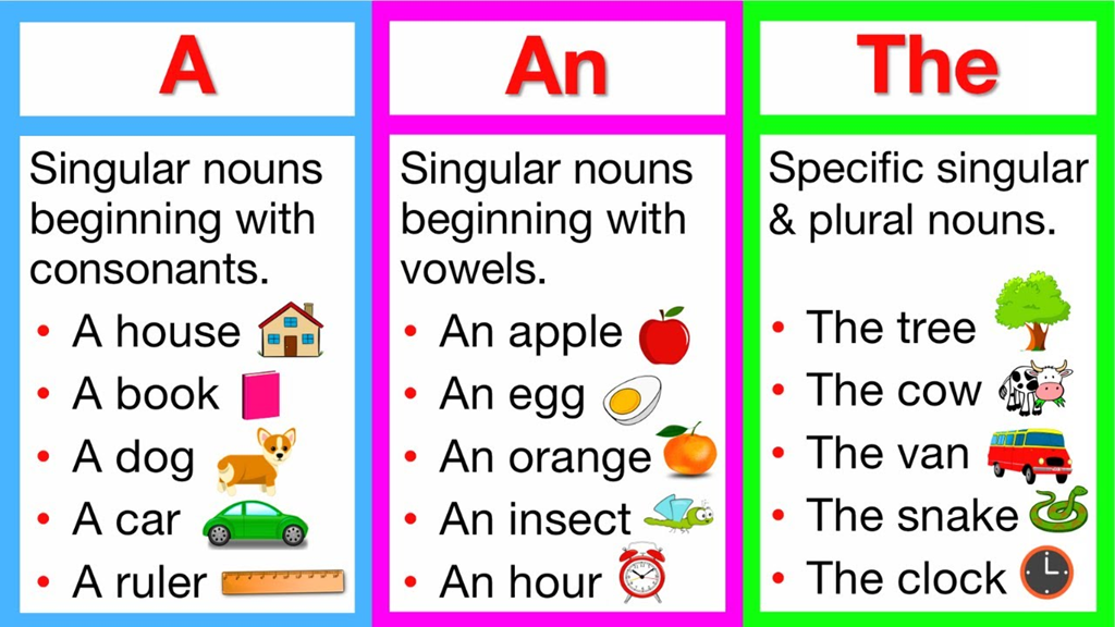 Articles are little words that we use before nouns to give more information about them. They help us understand if weāre talking about something specific or general. There are three articles in English: a, an, and the.