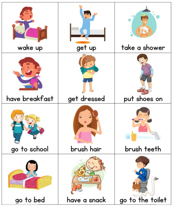 A daily routine is a list of things we do every day at certain times. It helps us stay organized and know what to expect throughout the day. Talking about your daily routine helps others understand what you do and when you do it!