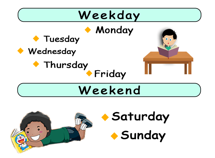 Weekdays: Monday, Tuesday, Wednesday, Thursday, and Friday. These are the days you go to school and work.