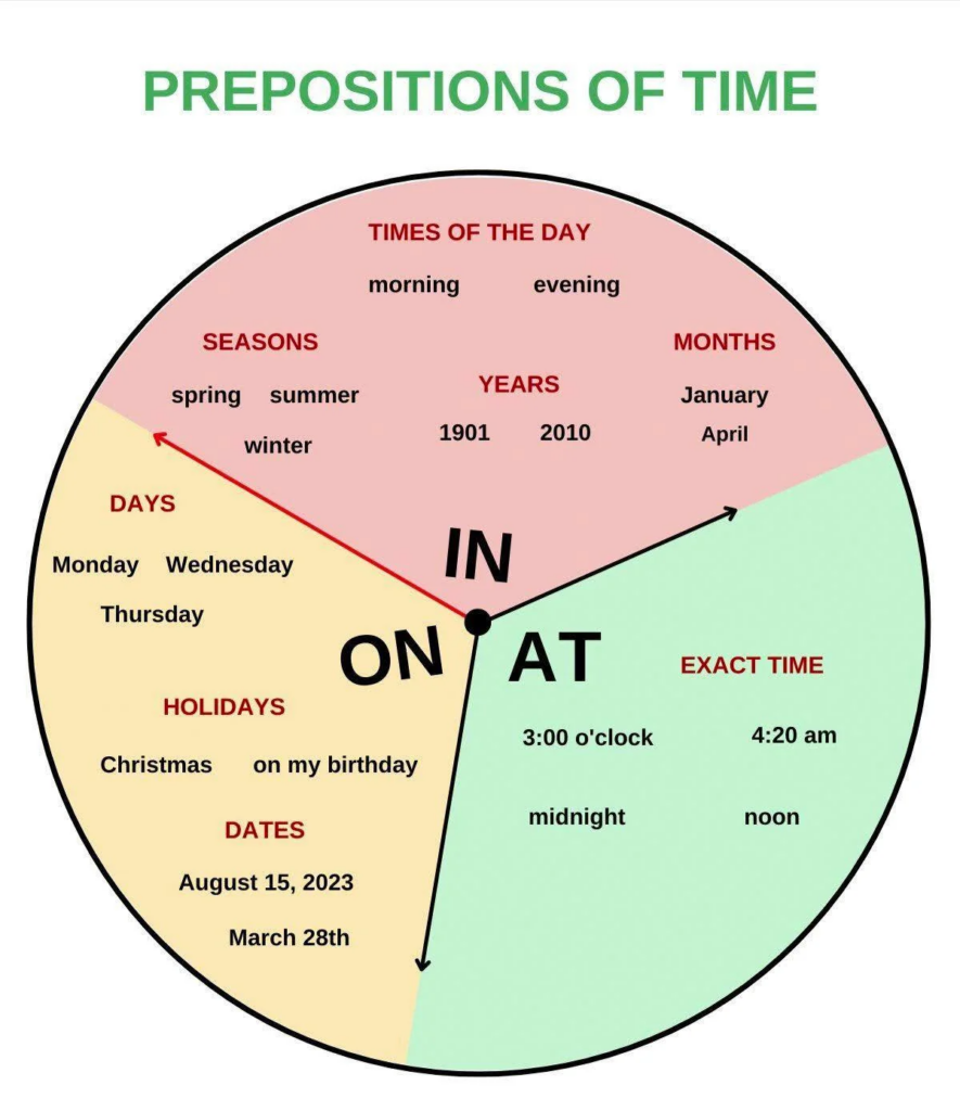 Prepositions of time help us talk about when things happen. They tell us if something happens in the morning, at a specific time, or on a specific day.
