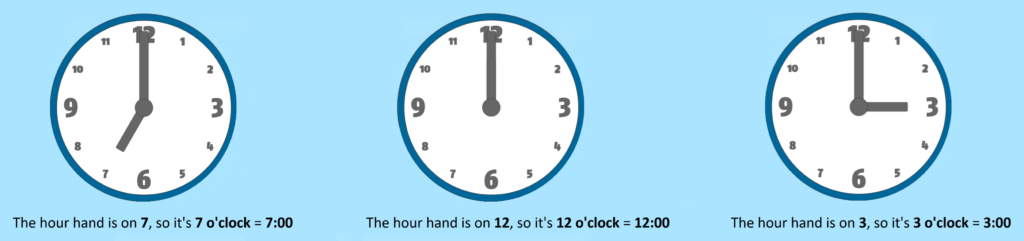 Remember: we only use āoāclockā for exact hours, when the minute hand is on the number 12. If the time is not exact, we donāt say āoāclockā.
